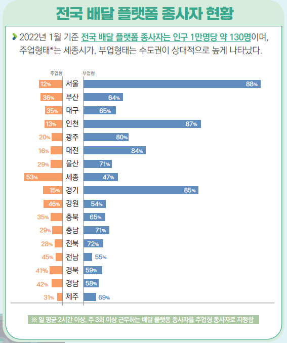 이외 부업 형태로 종사하는 비율은 📍서울시(88%)가 가장 높았으며, 주로 수도권(서울 및 경인지역)에서 상대적으로 높게 나타났습니다.
