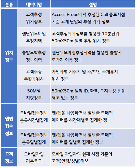 📝 50m*50m Cell 기준 추정 위치 정보 데이터와 모바일 앱/웹 접속 이력 데이터, 고객 기본 정보 데이터를 활용하여