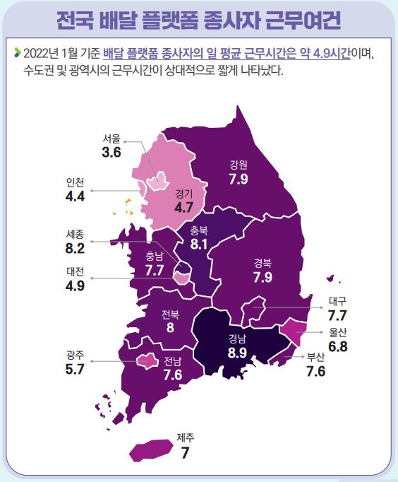 📝 배달 플랫폼 종사자의 근무 시간은 일 평균 약 4.9시간으로 나타났습니다.